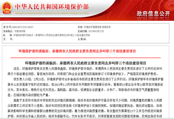 環(huán)保部刊發(fā)約談臨沂市長(zhǎng)原文:《環(huán)境保護(hù)部約談臨沂、承德兩市人民政府主要負(fù)責(zé)同志并叫停三個(gè)違法建設(shè)項(xiàng)目》